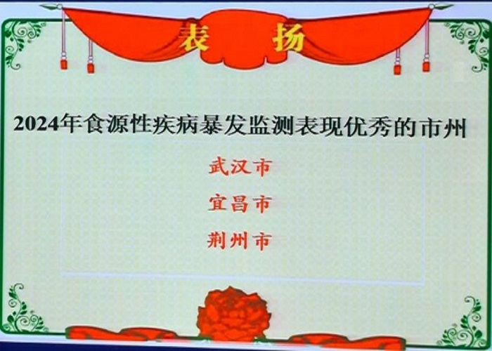 4月1日,在 2025 年湖北省食品安全与营养健康能力建设培训班上,湖北省疾病预防控制中心对 2024 年度全省食品安全风险监测工作中的优秀单位予以表扬。荆州市在食源性疾病监测、化学性污染物及有害因素监测、微生物及其致病因子监测中成果显著,再次荣登榜单。