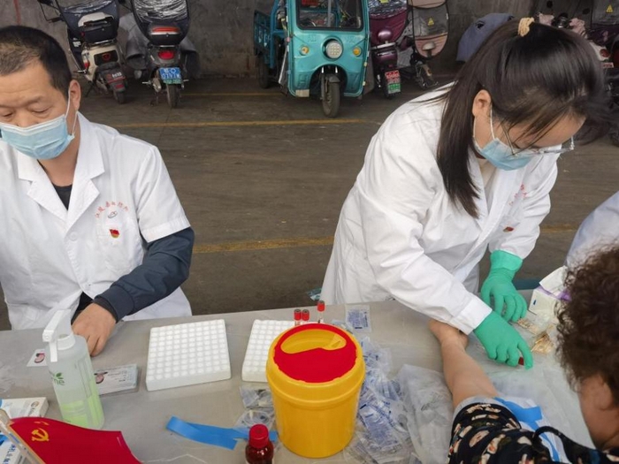 在活动现场,前来办理健康证的商户在工作人员的引导下,井然有序的按照排队登记、信息录入、采集血样的流程有条不紊开展现场采样工作。完成采样工作后,为确保群众三天内能领证到手,检验科加急检测,核对信息、办理健康制证。